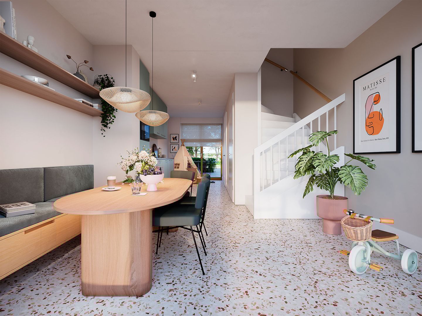 Via de tuin bereik je de voordeur en stap je de hal binnen met toilet. Loop vanaf de hal de deur door. Altijd al van een sfeervolle woonkeuken gedroomd? Daar sta je nu in: deze lichte open keuken met ruimte voor een grote tafel nodigt uit tot gezellige ontbijtjes met je gezin of uitgebreide diners met vrienden. Dankzij de grote ramen aan de ene kant én je eigen grote tuin op het zuiden aan de andere kant baadt deze ruimte de hele dag in het licht. In de tuin start je de dag met een kop koffie in de ochtendzon, borrel je bij zonsondergang en relax je in alle privacy – wat een luxe. Tegenover het keukenblok vind je de trap omhoog, met een handig geplaatste berging eronder.