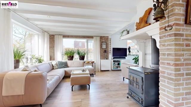 Via de ruime entree met garderobe/meterkast, toiletruimte en praktische kelderkast betreedt u de woning. De royale L-vormige woonkamer vormt het hart van het huis en is voorzien van een sfeervolle houtkachel en openslaande tuindeuren. De ruimte is afgewerkt met een stijlvolle vloerverwarmde tegelvloer. Dankzij de prettige lichtinval en de ruime opzet is dit een heerlijke plek om te ontspannen en te genieten.