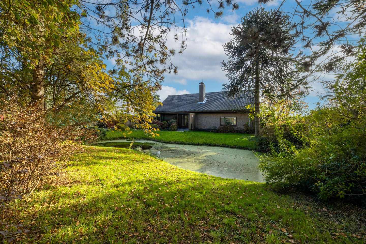 De tuin ligt rondom de woning en is voorzien van een karakteristieke vijverpartij aan de voorzijde. Aan de achterzijde grenst het perceel aan uitgestrekte weilanden, wat zorgt voor een weids, vrij uitzicht en een gevoel van ultieme privacy.