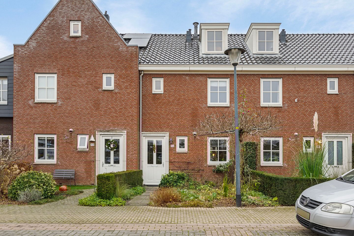 Aan de voorzijde van het huis is een gezellige, kleurrijke voortuin aangelegd. Entree aan de linkerzijde biedt toegang tot de lichte hal: op de vloer een klassiek lamelparket en de wanden zijn fris wit. Rechts de WC met fonteintje en twee inbouwkasten, links de trapopgang naar de verdiepingen.