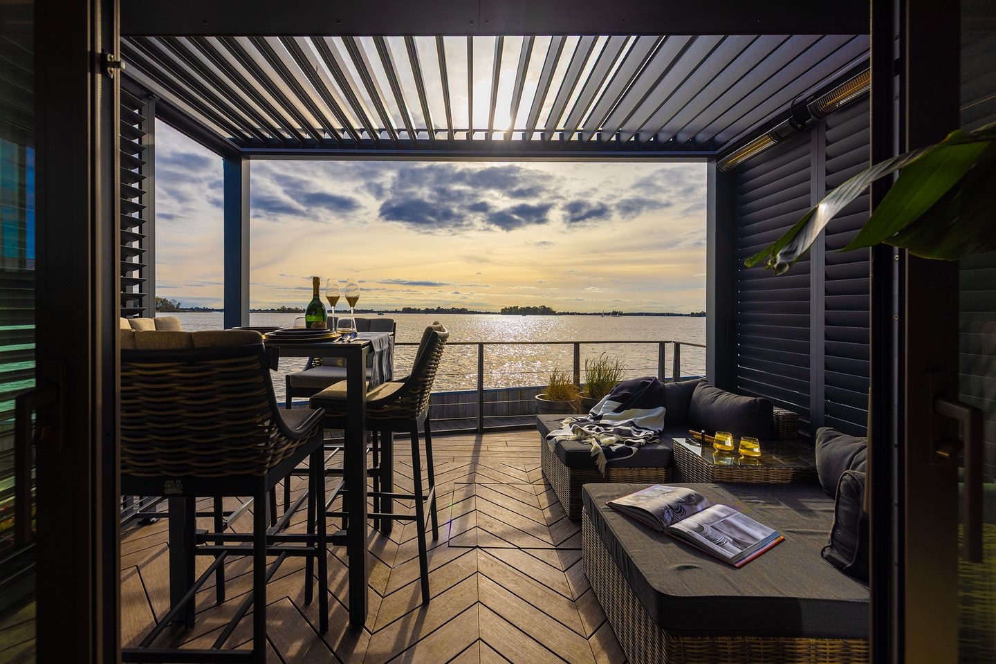 Grenzend aan de woonkamer ligt het royale terras met ingebouwde heaters, perfect voor sfeervolle avonden onder de sterren. Een ingebouwd muzieksysteem zorgt voor ambiance, terwijl de automatische zonwering u van comfort verzekert.