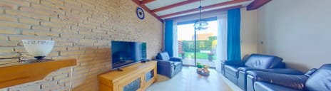 Binnen vind je een sfeervol huis met een praktische indeling en volop ruimte voor je eigen ideeën. De woonkamer is licht en uitnodigend, met uitzicht op het groen en een knusse zithoek waar je op koudere dagen de haard aansteekt en het leven even vertraagt. De keuken is eenvoudig maar netjes — precies de basis waar je iets eigens van kunt maken. Denk aan een landelijke woonkeuken met robuuste houten fronten, openslaande deuren naar buiten en lange tafels vol leven.
