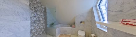 De ruime badkamer is uitgerust met een ligbad, douche, whirlpool, wastafelmeubel en toilet. Dankzij de speelse indeling en de rijke lichtinval voelt de verdieping extra ruimtelijk en comfortabel aan.