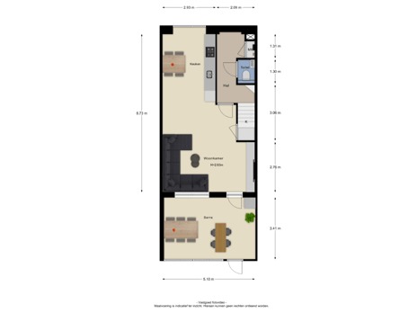 Bij binnenkomst komt u in een ruime en lichte hal met trapopgang, modern toilet met fontein en meterkast. Vanuit de hal bereikt u de woonkamer, die door de grote ramen aan de achterzijde en de openslaande verbinding naar de serre een heerlijk lichte en ruime leefomgeving biedt. De woonkamer is netjes afgewerkt met hoge plinten, een laminaatvloer en warme wandafwerking, waardoor het een gezellige plek is om samen te komen.