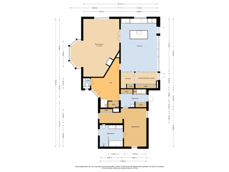 Terug in de hal bereikt u de praktische bijkeuken. Deze ruimte is ingericht met vaste kasten aan beide zijden en een wastafel. Daarnaast biedt deze directe toegang naar buiten en de aangrenzende slaapkamer. Een functionele en efficiënte ruimte die het dagelijks wooncomfort aanzienlijk vergroot. De slaapkamer is royaal van opzet en biedt moeiteloos plaats aan een tweepersoonsbed. De kamer is voorzien van een stijlvolle inloopkast, waardoor kleding en persoonlijke spullen overzichtelijk kunnen worden opgeborgen. Aansluitend vindt u de badkamer, die volledig privacy biedt en luxe toevoegt aan deze slaapkamer.