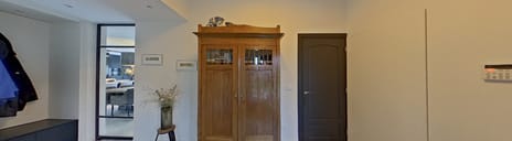 Begane grond: Via de statige oprijlaan bereikt u de villa. Bij binnenkomst wordt u verwelkomd in een ruime en stijlvolle hal die direct de toon zet. Hier vindt u het toilet en de trapopgang en heeft u toegang tot de woonkeuken, de bijkeuken en de slaapkamer met badkamer. De entree vormt zo het kloppend hart van de villa.