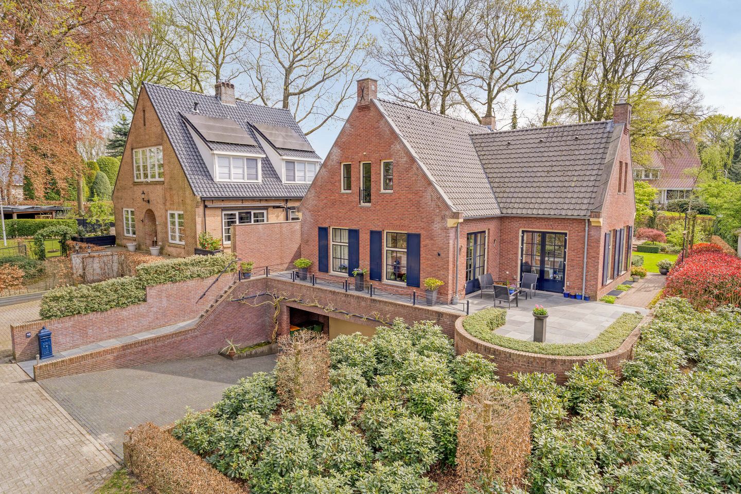 Ook de achterzijde maakt indruk. Hier ontvouwt zich een sfeervolle aangelegde tuin met strakke gazons, volwassen beplanting, beschutte borders en meerdere terrassen om op elk moment van de dag van zon of schaduw te genieten. De overdekte overkapping aan de achtergevel vormt een heerlijke plek om buiten te zitten, met vrij uitzicht over het groen en een directe verbinding met het huis.