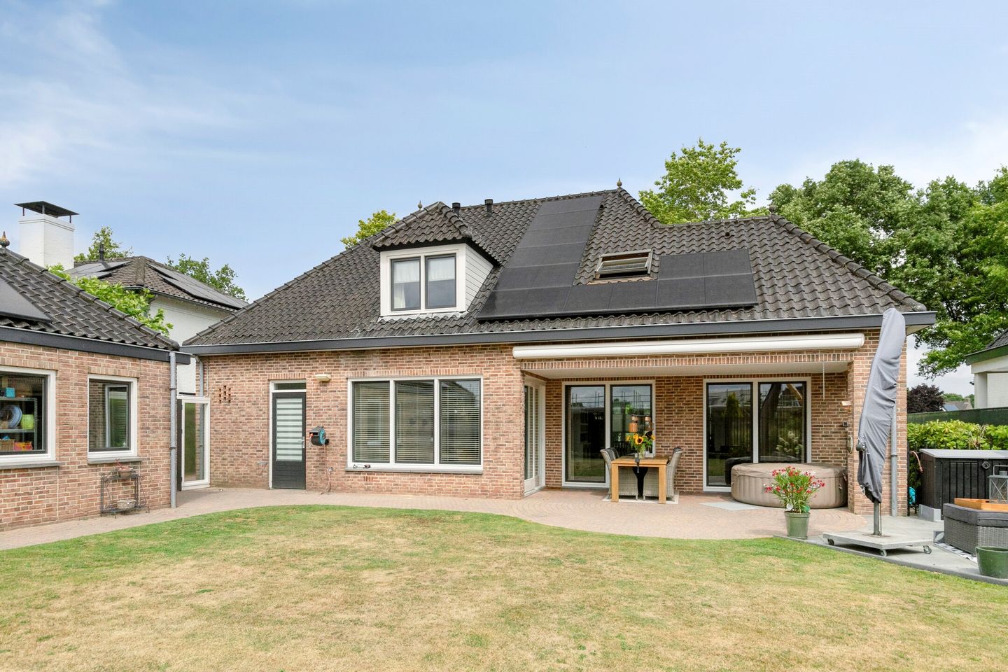 Prachtig aangelegde tuin met optimale privacy, groot gazon, diverse terrassen, waarvan 1 overdekt, elektrisch bedienbaar zonneluifel. Fraai ingerichte voortuin met gazon en grote oprit met plaats voor 5 auto's op eigen terrein.