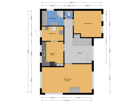 De keuken in praktische L-opstelling is voorzien van inbouwapparatuur en biedt ruimte voor een eettafel. Aansluitend vindt u de bijkeuken met wasmachineaansluiting en toegang tot het terras aan de zijkant van de woning.