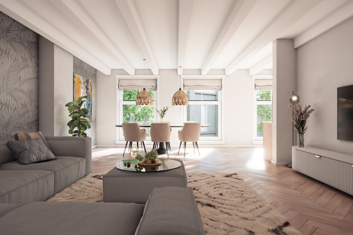 De heerlijke L-vormige woonkamer is voorzien van authentieke balken en grote raampartijen met houten kozijnen, isolerend dubbelglas (HR++) en een mooi lichtinval. Vanuit de woonkamer heb je prachtig uitzicht op De Grote Karakteristieke Dorpskerk. De ruimte biedt voldoende plek voor een gezellige grote hoekbank en een ruime eettafel, waar je heerlijk met gezelschap kan dineren. Aan de voorzijde heb je geen directe inkijk en daardoor erg veel privacy. Via de keuken heb je een doorloop naar de andere kant van het appartement. In het appartement zal geen keuken aanwezig zijn, ter plaatse van de keukeninrichting worden standaard de nodige voorzieningen aangebracht en de keukenaansluitingen zijn voorbereid. De keuken kan volledig naar eigen smaak worden ingericht. Het volledige woonoppervlak is voorzien van vloerverwarming via een warmtepomp.