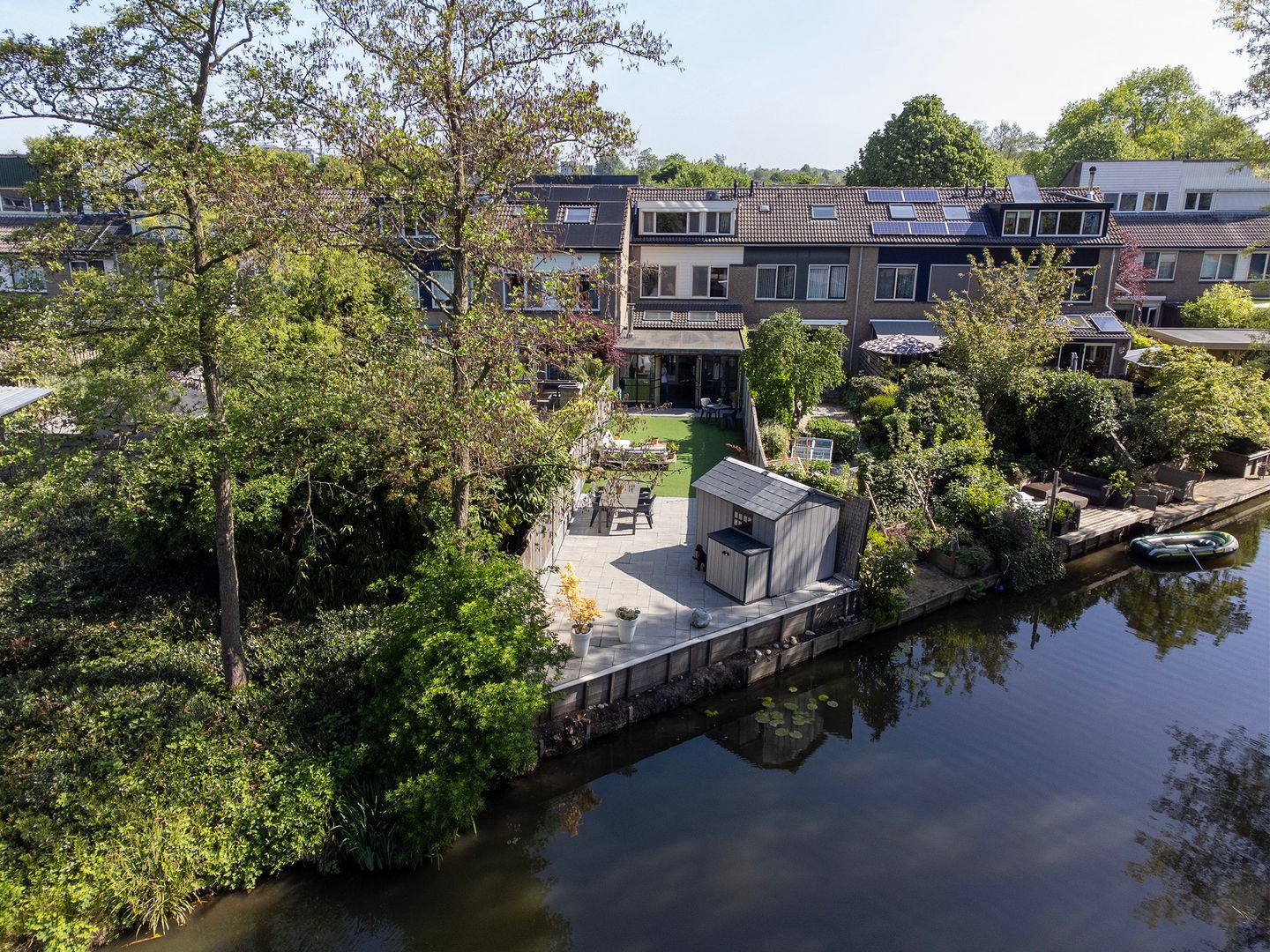 Uitgebouwde en bijzonder ruime EENGEZINSWONING (geschakelde tussenwoning) met eigen parkeerplaats, aangebouwde berging, serre en een ruim 20 meter diepe en zonnige achtertuin op het zuidwesten aan een singel. De tuin is aangelegd met kunstgras en betegeling en achterin de tuin staat nog een tuinberging.