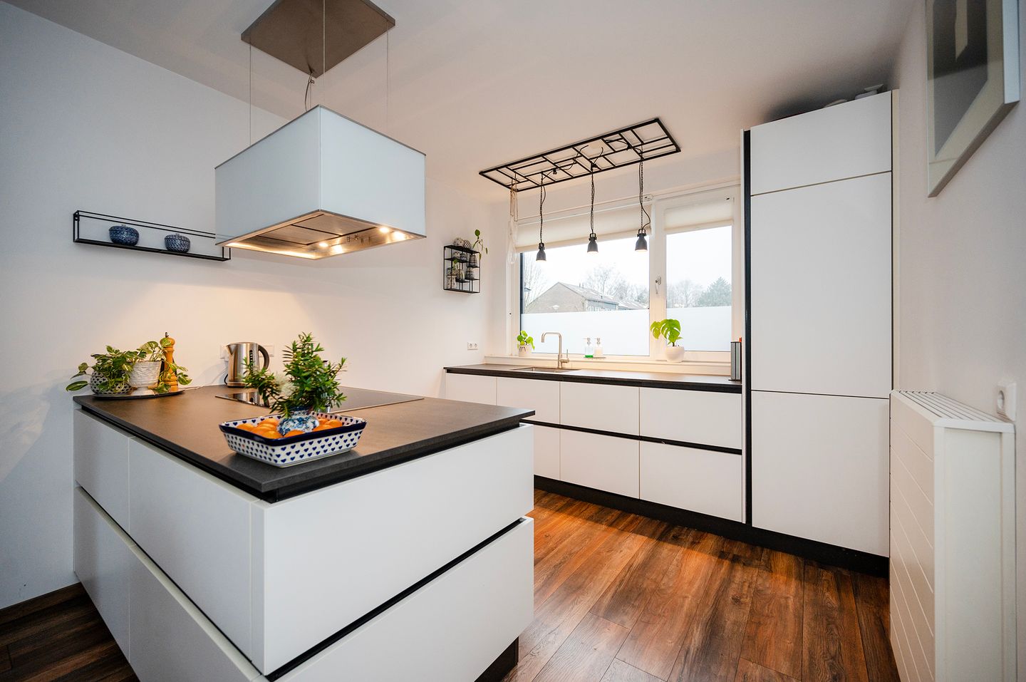 - ingebouwd zijn een inductie-kookplaat, heteluchtoven, wave circulatiekap (plasmamade), koel-/vriescombinatie, vaatwasmachine en voldoende kastruimte;