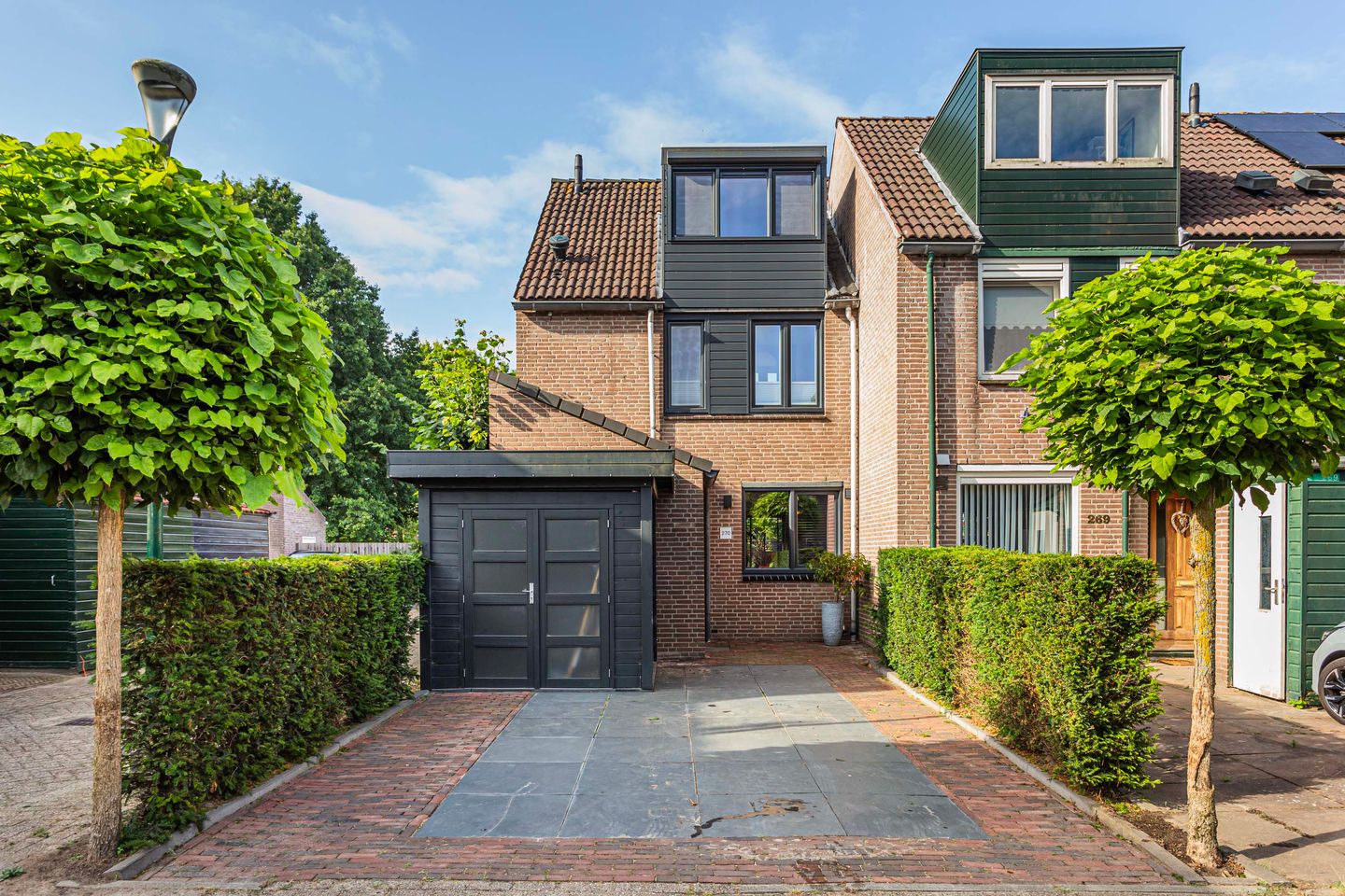 De met fraaie sierbestrating aangelegde voortuin biedt de mogelijkheid om twee auto’s te parkeren op eigen terrein en geeft toegang tot de aangebouwde houten berging met openslaande deuren.
