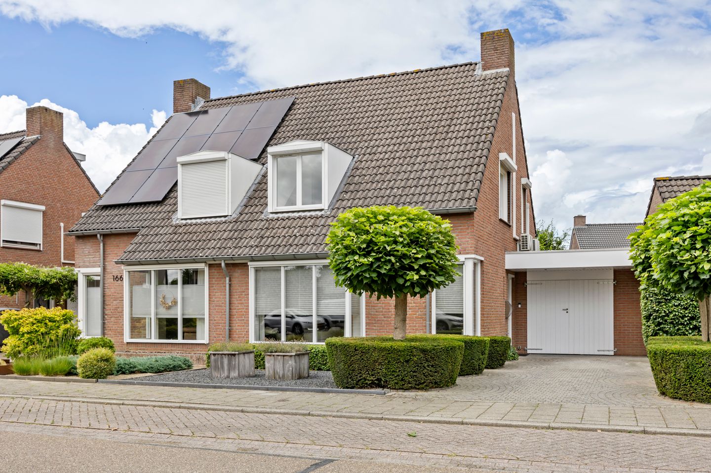 Begane grond: Via de entree met garderobe en modern toilet bereik je de sfeervolle L-vormige woonkamer (ca. 40 m²), afgewerkt met een prachtige massief eiken vloer en met optimale tuinbeleving. De halfopen keuken (ca. 5 m²) is geplaatst in hoekopstelling en voorzien van een moderne, luxe keukeninstallatie. De praktische bijkeuken verbindt de woning met de inpandige garage — een zeer functionele toevoeging! Eerste verdieping: Op de eerste etage bevinden zich drie ruime slaapkamers, waarvan één momenteel in gebruik is als luxe dressing. De badkamer is comfortabel, stijlvol afgewerkt en compleet uitgerust met ligbad, inloopdouche, wastafelmeubel en tweede toilet. Tweede verdieping: Via een vaste trap bereik je de zolderverdieping, waar de vierde slaapkamer is gerealiseerd. Hier is door middel van op maat gemaakte schuifkasten optimaal gebruik gemaakt van de beschikbare ruimte, met volop opbergmogelijkheden.