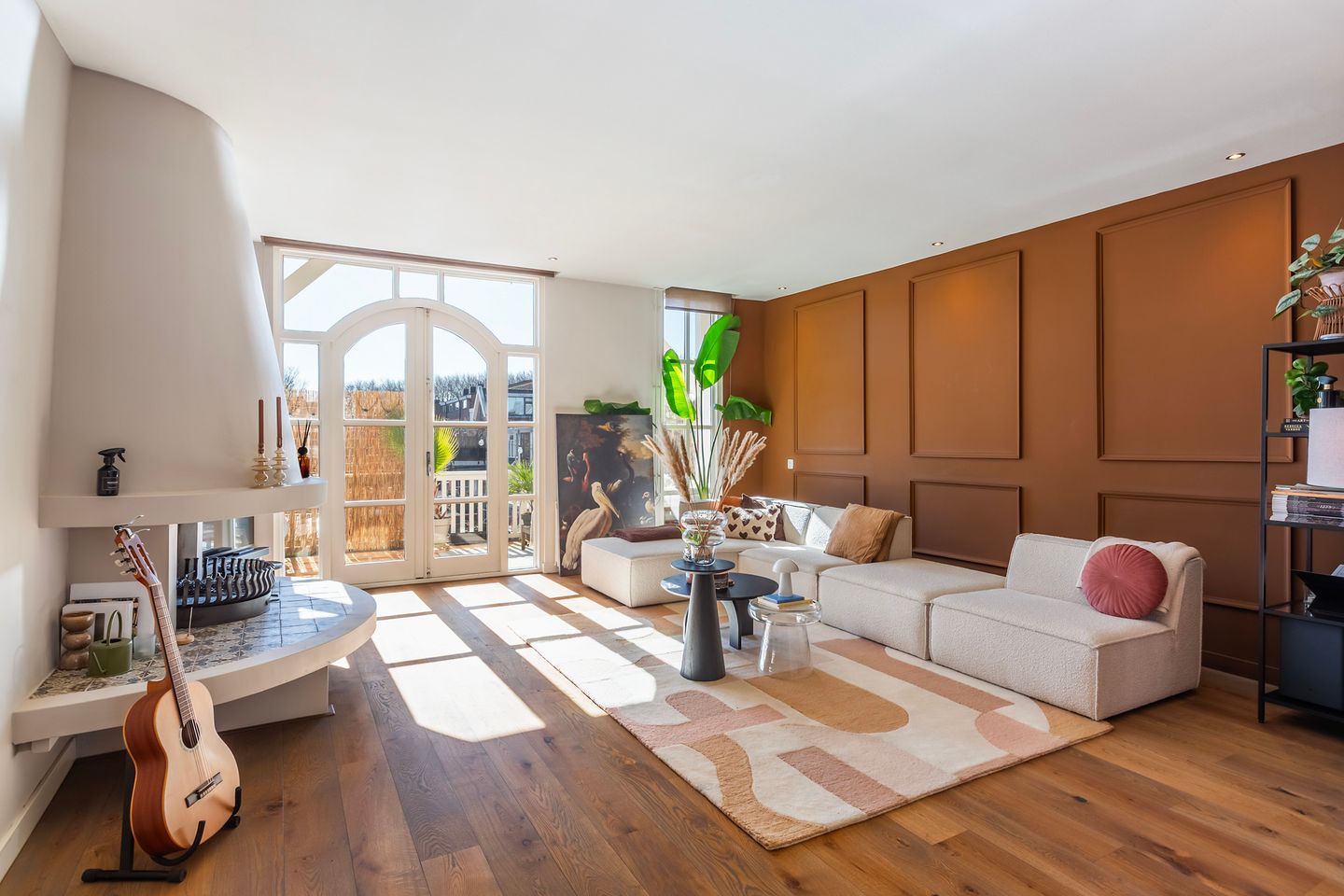 De met recht royaal te noemen woonkamer is aan de achterzijde van de woning gelegen. Wat als eerste opvalt is de grote karakteristieke haard en de openslaande deuren naar het terras. In deze woonkamer is het heerlijk vertoeven!