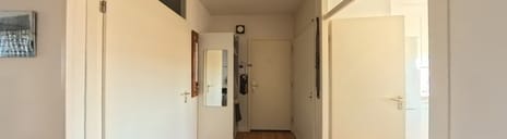 De voordeur is bereikbaar vanaf de galerij en geeft toegang tot open entreehal, die in het verlengde in verbinding staat met de woonkamer. De mooie laminaatvloer is drempelloos gelegd in alle vertrekken en de wanden zijn afgewerkt met overschilderd glasweefselbehang. Naast de voordeur bevindt zich de meterkast met daartegenover een vaste kast. Ook is er toegang tot de keuken, de eerste slaapkamer en is er een open verbinding met zowel de hal als de woonkamer.