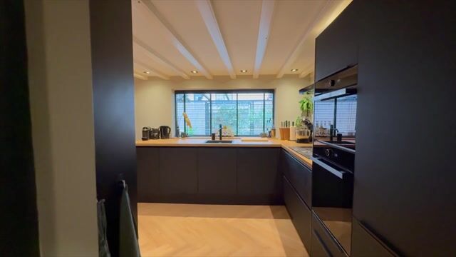 De donkere keuken in hoekopstelling is voorzien van een houten aanrechtblad en diverse inbouwapparatuur, waaronder een oven, een combi oven/magnetron, een vaatwasser met besteklade, een hoge koelkast, een vriezer, een 10L boiler, een kookplaat en een afzuigkap. Daarnaast is er nog een hoge kastenwand aanwezig, met in het midden een open gedeelte met planken.