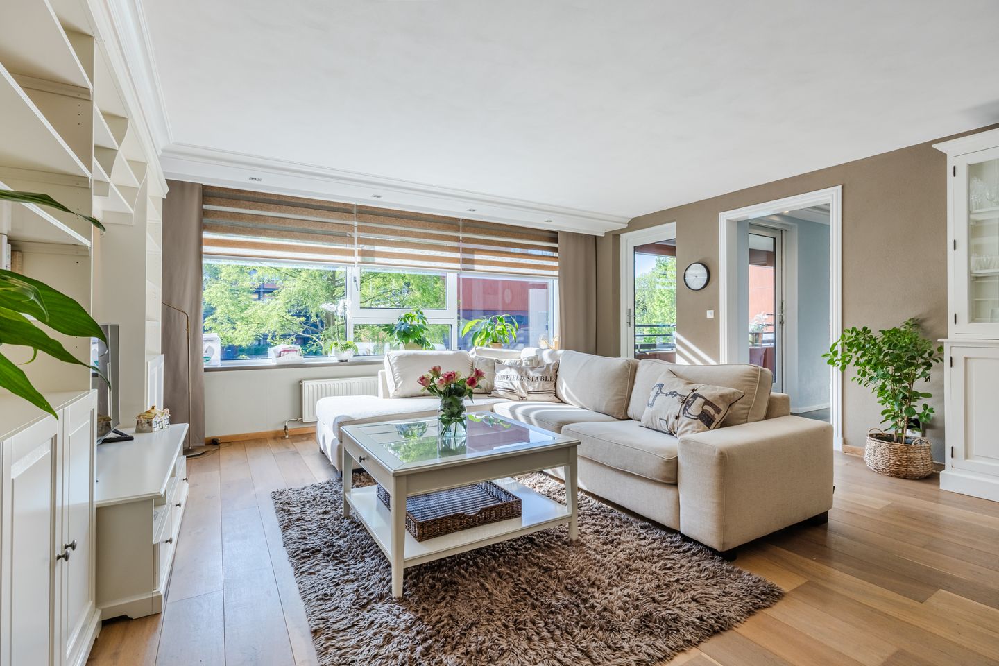 De woonkamer is heerlijk licht, ruim van opzet en voorzien van een gestuukt plafond met koof en led-verlichting. Vanuit de woonkamer is er directe toegang tot het balkon en zicht op het groen.