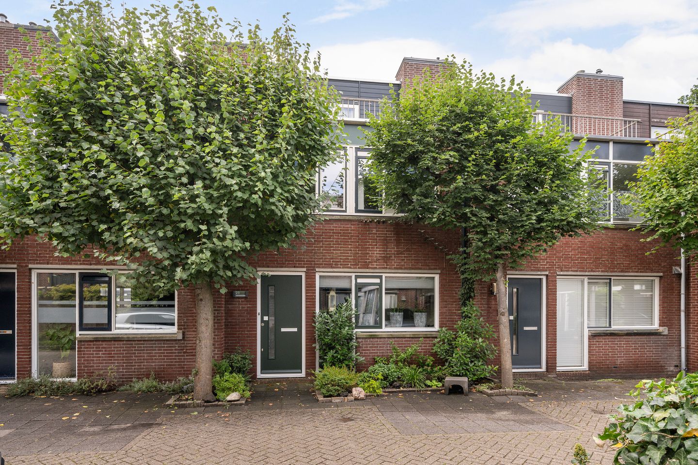 Vanaf de straat is er een directe toegang tot de voordeur, waarbij langs de gevel een lage stenen border is gemaakt die is voorzien van mooie beplanting. Aan weerszijde staan twee hoge bomen, wat zorgt voor een vrolijk en verzorgd aangezicht.