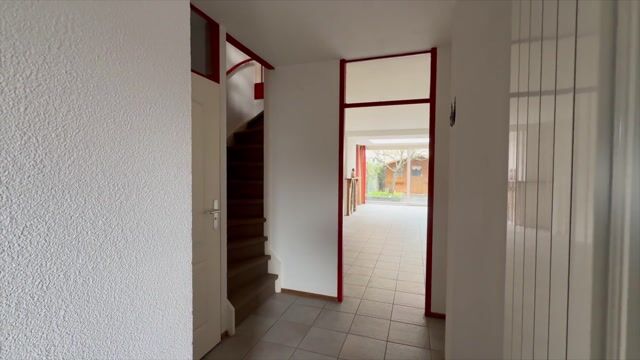 Na de voordeur is er een binnenkomst in de afsluitbare entreehal met de meterkast. Deze biedt toegang tot de woonkamer, het gedeeltelijk betegelde toilet en de berging, die in open verbinding staat met de hal. Achter de voordeur ligt een schoonloop mat, de wanden zijn voorzien van spachtelputz en op de vloer liggen plavuizen.