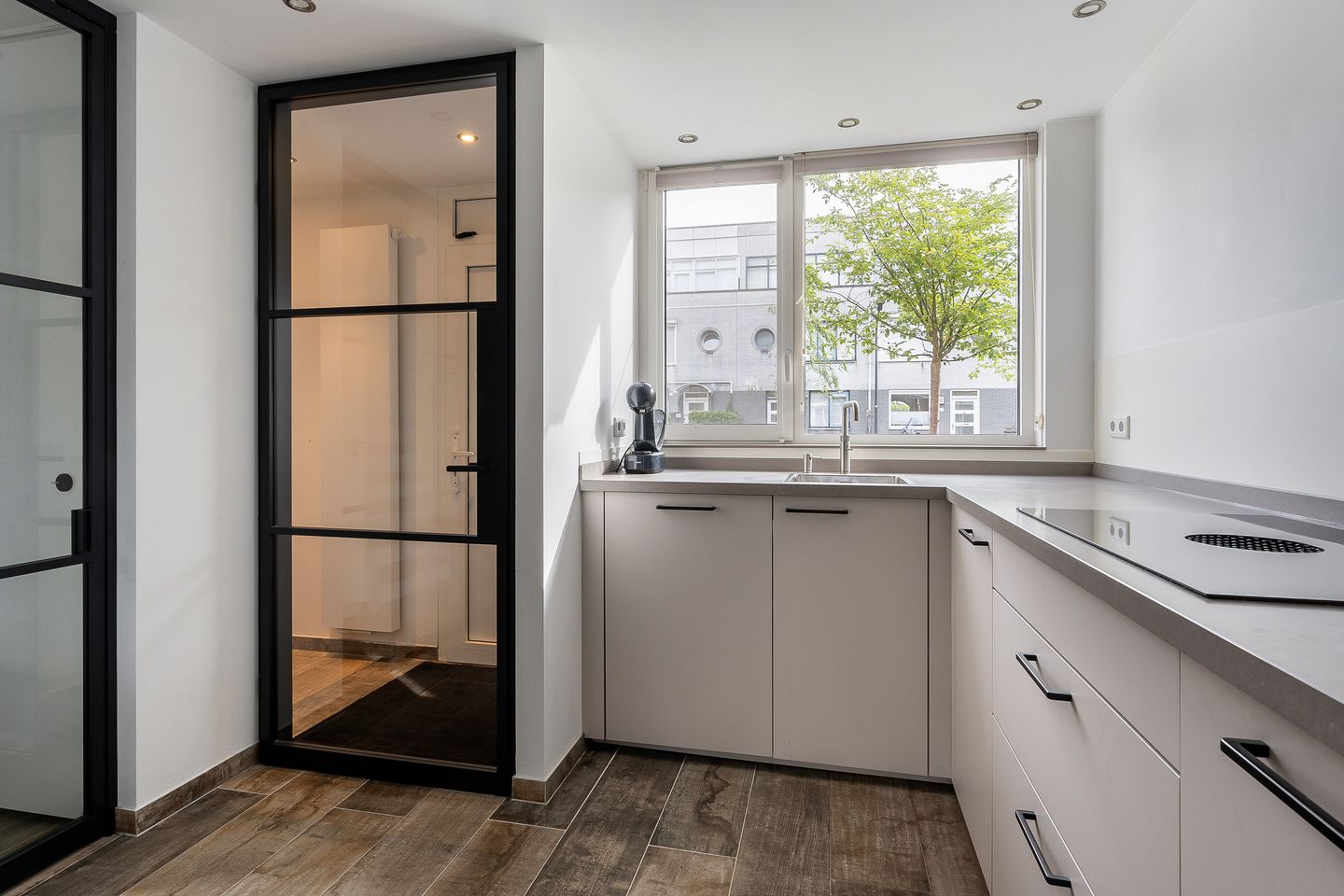 Bij het betreden van de woning komt u terecht in de entreehal. Deze is voorzien van een stenen houtlook vloer, welke doorloopt tot in de keuken, de woonkamer, de aparte toiletruimte en de schuur. Verder heeft de entreehal een prachtige garderobekast van ‘Van de Graaf’. Wat niet alleen zorgt voor een luxe uitstraling, maar er tevens voor zorgt dat de jassen en andere spullen gemakkelijk en uit het zicht opgeborgen kunnen worden. De ‘Gewoon Gers’ stalen deur geeft toegang tot de woonkamer. Ook is er in de woonkamer met een ‘Gewoon Gers’ wand een halletje gecreëerd. Deze hal beschikt over de aparte toiletruimte en de trapopgang. De gehele begane grond is in 2022 verbouwd en heeft daardoor een fantastische nieuwe look gekregen. Ook de keuken is in 2022 geplaatst. Deze moderne keuken uit 2022 is voorzien van een BORA inductiekookplaat met ingebouwde afzuiging, Quooker, een vaatwasmachine en een oven, magnetron en een koel-vriescombinatie van Siemens. In het plafond zitten inbouw spotjes verwerkt, welke ook aan de achterzijde van de woning, in de woonkamer, zijn terug te zien. Door middel van de openslaande deuren is de onderhoudsvriendelijke achtertuin te betreden.