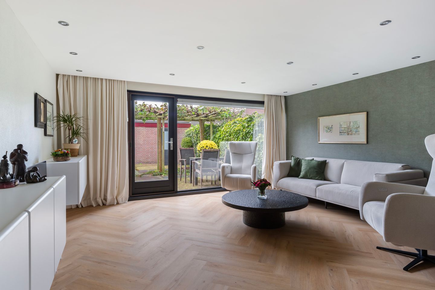 De woonkamer is een oase van licht dankzij de grote vloer-tot-plafond ramen. Op de vloer ligt een prachtige PVC visgraatvloer met vloerverwarming (2023), wat zorgt voor extra comfort. Via de loopdeur stap je zo de zonnige achtertuin in.
