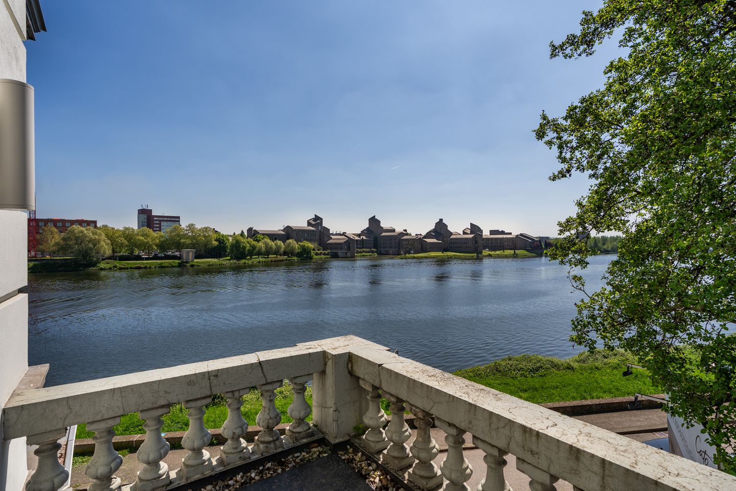 En dan het uitzicht… Elke dag anders, altijd indrukwekkend. Kijk uit over de Maas, met haar traag stromende vaart, het iconische Bonnefantenmuseum, de imposante Kennedybrug en het markante Limburgs Gouvernement aan de overkant.