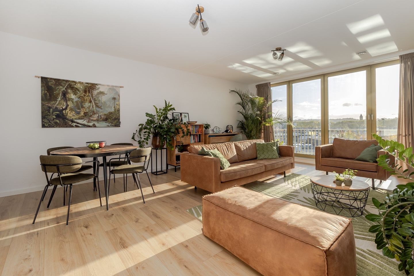De hal bij binnenkomst geeft toegang tot het separate toilet en leidt u naar de ruime woonkamer. Deze lichte woonkamer (ca.34m²) is het hart van het appartement en geniet van veel natuurlijke lichtinval, te danken aan de grote raampartijen. Voor extra comfort zijn zowel de woonkamer als het balkon voorzien van screens, zodat u eenvoudig de lichtinval kunt reguleren. De open keuken (ca.5m²) is modern uitgevoerd en beschikt over een hoog model koelkast, vaatwasser, combi-oven, 4-pits inductiekookplaat en afzuigkap. Vanuit de woonkamer heeft u direct toegang tot het zonnige zuidoostelijk gelegen balkon, dat ook bereikbaar is vanuit beide slaapkamers.