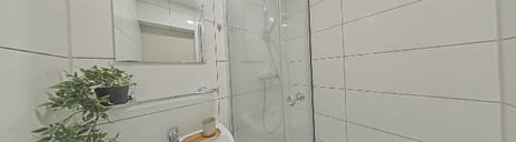 De slaapkamer biedt toegang tot de compacte maar functionele badkamer, voorzien van een douchecabine en wastafel. De authentieke vuurhouten vloer loopt door de gehele woning en geeft het appartement een warme, karaktervolle uitstraling. Zowel de keuken als de badkamer zijn in 2019 compleet vernieuwd.
