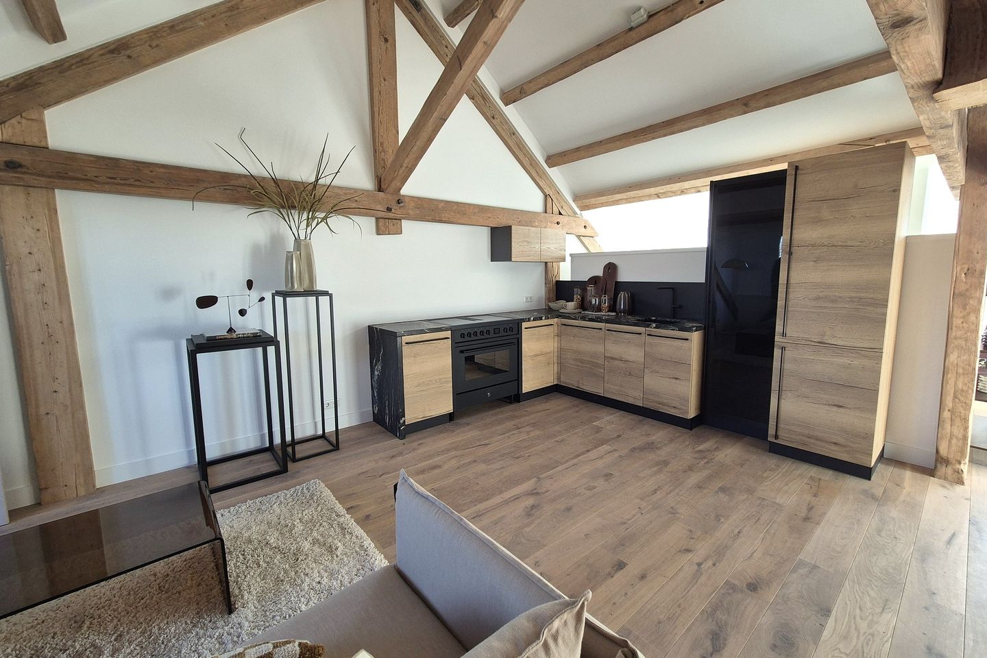 Op de bovenste woonlaag bevindt zich de imposante en uiterst sfeervolle living met een oppervlakte van maar liefst 65 m² en met aan weerszijden royale dakkapellen en een dakvenster, waardoor het appartement veel daglicht geniet. De originele houten dakconstructie en talrijke spanten zijn hier behouden gebleven en geven de ruimte een uniek karakter. Tenslotte bevindt zich op deze verdieping nog een afzonderlijke wasruimte en een overloop c.q. trapportaal met aansluitend een toiletruimte met wandcloset en fonteintje.
