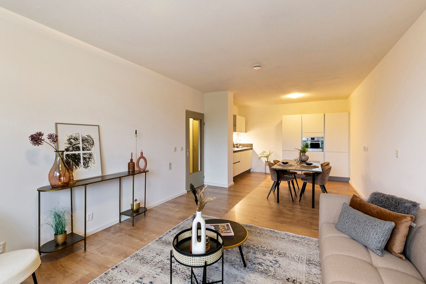 Via de lift of trap kom je bij het appartement. Entree/hal met toegang naar alle vertrekken. De woonkamer (21m²) met open keuken (9m²) is voorzien van een mooie laminaatvloer en biedt toegang naar het heerlijke balkon (4 m²) met een mooi uitzicht over de omgeving. De moderne open keuken in hoekopstelling beschikt over alle benodigde (inbouw)apparatuur, te weten: 4-pits inductiekookplaat met afzuigkap, vaatwasser, koelkast, vriezer, combioven en een spoelbak.