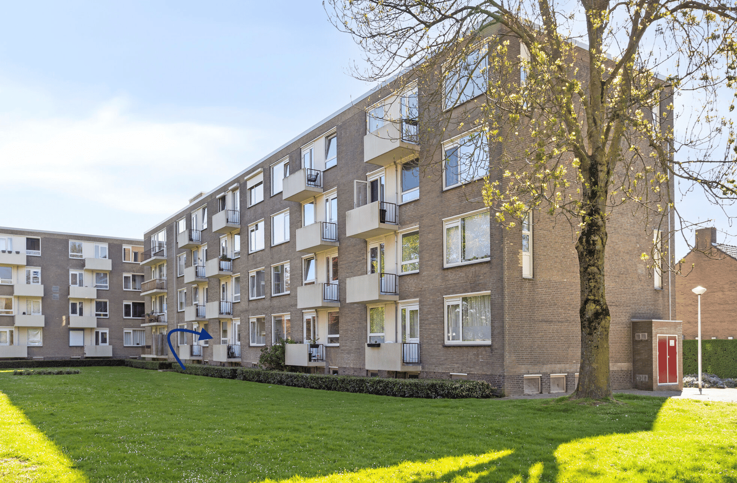 Via de centrale entree bereik je het appartement, dat zich op de begane grond bevindt. Dankzij de beperkte hoeveelheid traptreden is de woning eenvoudig toegankelijk.
