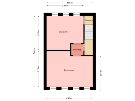 Overloop met toegang tot twee slaapkamers van respectievelijk ca. 16 m² en 12 m², beide voorzien van een donkere vloerbedekking. De slaapkamer aan de achterzijde van de woning biedt toegang tot de zolderverdieping.