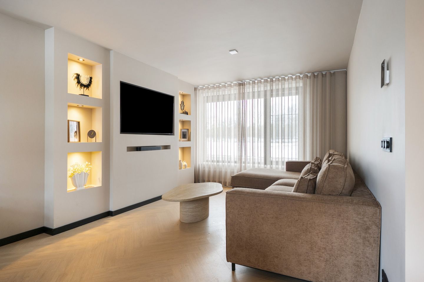 Via een glazen deur bereik je de royale doorzonwoonkamer, die dankzij de grote raampartijen aan zowel de voor- als achterzijde beschikt over veel natuurlijke lichtinval. De woonkamer is strak afgewerkt en voorzien van een laminaatvloer in visgraadmotief en airconditioning (koelen en verwarmen), wat zorgt voor optimaal wooncomfort.