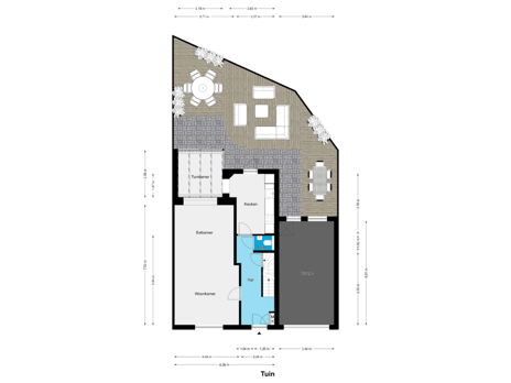 De ruime living van 752 x 404 is afgewerkt met een houten vloerdelen en biedt een warme, sfeervolle leefruimte. Aansluitend bevindt zich de tuinkamer (295 x 278) met een hardstenen plavuizenvloer, aluminium schuifpui en overvloedige lichtinval, die een direct contact met de tuin creëert.