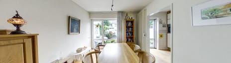 Grote ramen aan de voor- en achterzijde zorgen voor veel lichtinval in de woonkamer (circa 7,51 x 3,63/3,34). Het zitgedeelte is aan de voorzijde, met uitzicht naar de voortuin en het plantsoen, en vanaf het eetgedeelte kijkt u naar de achtertuin. De mooie parketvloer past bij diverse interieurstijlen, van landelijk tot modern.