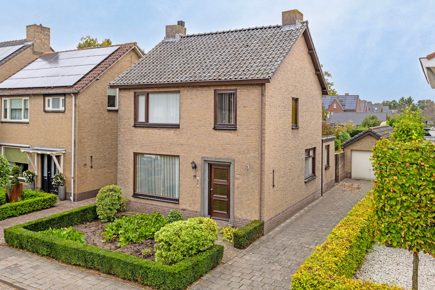 De grote vrijstaande stenen garage heeft een betonvloer, pannendak, metalen kanteldeur, loopdeur naar de tuin en is voorzien van elektra. Aan de voorzijde van de garage een ruime eigen oprit met parkeergelegenheid voor meerdere auto’s.
