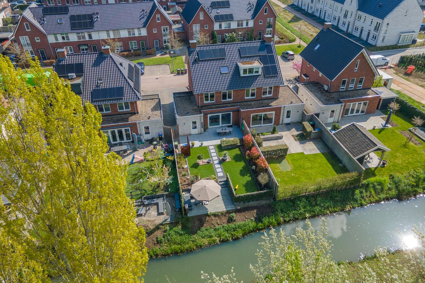 Terug naar buiten, hier wil je zijn. Vanuit de woonkamer kom je op het terras, dat een verlengstuk is. Het andere terras grenst aan het water. Zie je jezelf al zitten, hoor je de vogeltjes al fluiten? Tussen de beide terrassen ligt een mooi stuk tuin met gras en borders, olijfboom en bananenplant, afgescheiden kliko-opstelplaats en een deur naar de garage. By night is er een prachtig lichtplan zichtbaar, zie ook de bijgevoegde foto's. Wat deze woning nog aantrekkelijker maakt, is de eigen achterom langs de garage. Het perceel is 324 m² groot en biedt aan de voorzijde een oprit, overdekt entree en een voortuin.