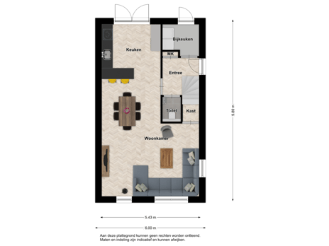 Via de ruime entree met meterkast (v.v. waterontharder) bereikt u de hal met modern toilet. De woonkamer is verrassend licht door de grote raampartijen en voorzien een trapkast en pvc-vloer met vloerverwarming. De openslaande deuren naar de tuin zorgen voor een fijne verbinding tussen binnen en buiten.