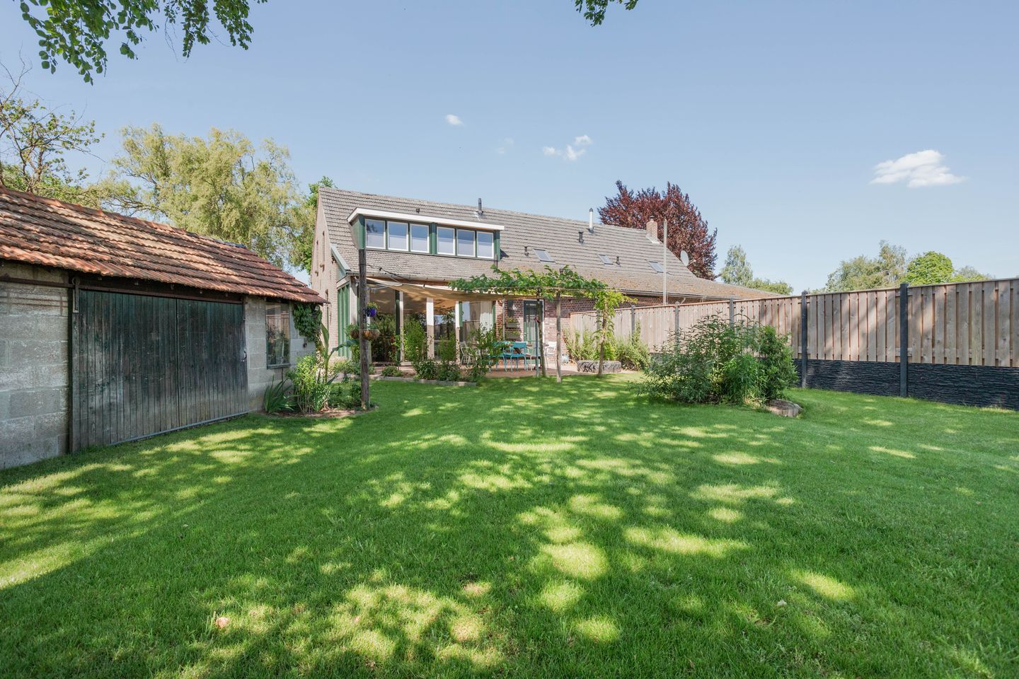 De zonnige achtertuin is gelegen op het zuiden en biedt een ideale plek om te ontspannen en te genieten van het buitenleven. Het sfeervolle terras is perfect voor een gezellige borrel met familie en/of vrienden of gewoon om even te relaxen. Het grote gazon biedt genoeg ruimte voor allerlei activiteiten, van tuinieren tot spelletjes met de kinderen of een rustige plek om even te ontsnappen aan de drukte van de dag. De tuin is geheel omheind en beschikt over een vrije achterom. Ook is er een schuur die ideaal is voor het opslaan van tuingereedschap en andere spullen. Een extra pluspunt aan deze tuin is het heerlijke rustige uitzicht over de landerijen.