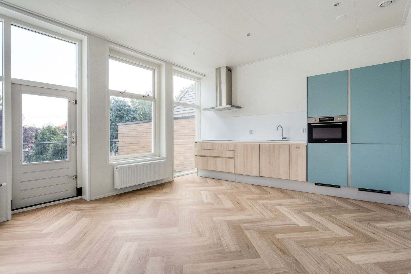 Eerste verdieping: Boven op de overloop vind je een vaste kast en toegang tot de ruime sfeervolle woonkamer. De ruime woonkeuken is een fijne plek om te koken en te leven en is voorzien van een 4-zone inductiekookplaat, afzuigkap, combimagnetron, vaatwasser, koelkast en vriezer. Vanuit hier stap je zó het dakterras op, perfect voor een kop koffie in de ochtendzon of een etentje in de buitenlucht. De badkamer is uitgerust met een inloopdouche en wastafelmeubel, daarnaast is er een separaat toilet met fontein.