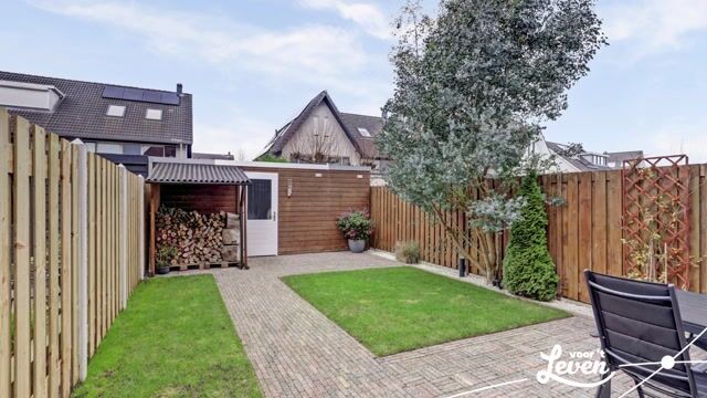 De achtertuin is netjes aangelegd met gras, plantborders en een brede houten berging over de volledige breedte. Via de berging heb je direct toegang tot het achterom, wel zo prettig met fietsen of tuinspullen. De woning heeft bovendien energielabel A, wat betekent dat het huis al een nette basis heeft qua energieprestatie.