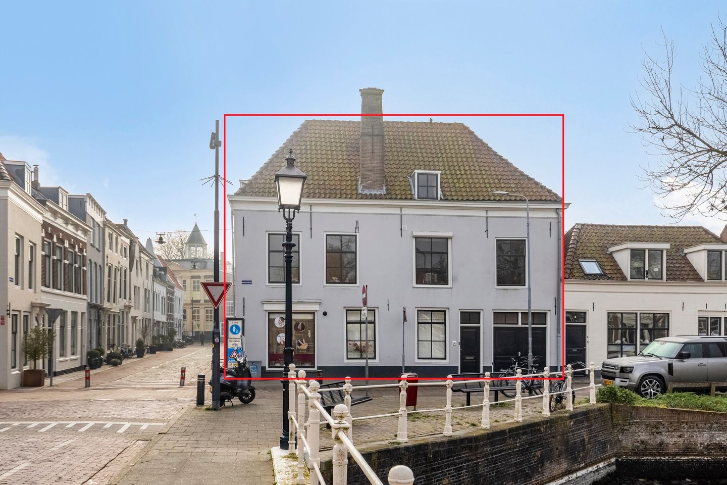 - Eerste verdieping: Overloop. Toegang tot royale lichte woonkamer met veel raampartijen en uitzicht op stad en Binnengracht. Voorts een ruime dichte keuken. Toilet met fonteintje. Tenslotte een slaapkamer met toegang naar badkamer v.v. ligbad, douche en wastafel.
