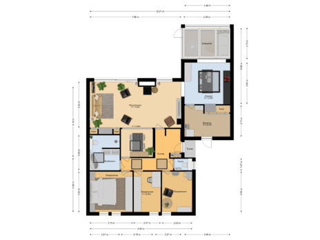 De airco met koel- en verwarmfunctie, de houtkachel en de luxe gashaard zorgen voor comfort, warmte en sfeer. De woonkamer heeft een mooi uitzicht op de tuin en is v.v. een 7 meter breed elektrisch knikarmscherm met een uitval van 3 meter.