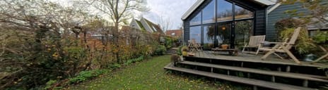 Karakteristieke twee-onder-een-kapwoning, (historische melkrijderswoning) voorhuis en achterhuis/atelier, met bloemrijke voor-, zij- en achtertuin direct gelegen aan eindeloos Natura 2000 gebied. Vakantiegevoel in optima forma. Vergezichten richting Markermeerdijk over de oeroude weilanden. Dit alles gecombineerd met moderne duurzaamheid.