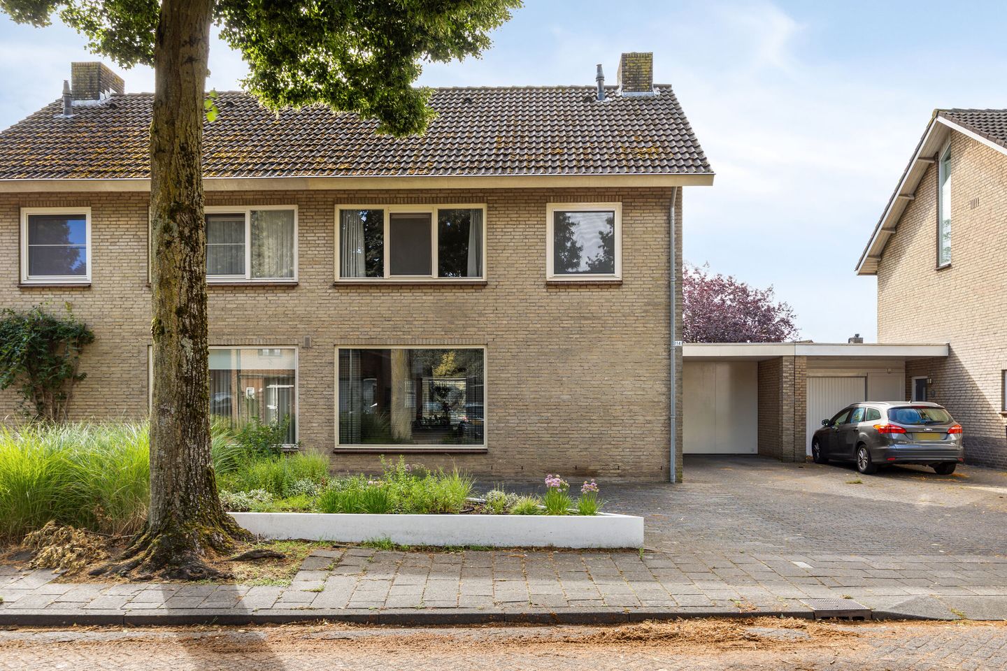 Royale voortuin met oprit voor 3 auto's en carport.