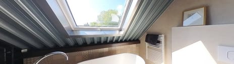 Op de verdieping in het nieuwe gedeelte vind je een zeer fraaie en zeer riante derde badkamer met vrijstaand ligbad, afzonderlijke douchecabine, toilet, elektrische vloerverwarming en sfeervol Ibiza-tegelwerk. Naast de badkamer is een grote slaapkamer aanwezig en aan de andere zijde van de badkamer is nog een open ruimte (vide) aanwezig die nu in gebruik is als gamehoek. Deze ruimte is eventueel eenvoudig als grote extra slaapkameer te benutten door er simpelweg een wand te plaatsen. Ook de riante entree met toilet, meterkast en technische ruimte (met cv en mechanische ventilatie) zijn strak uitgevoerd in dezelfde stijl als de rest van de woning.