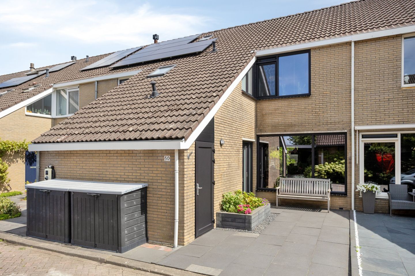 De achtertuin is in 2017 opnieuw aangelegd en onderhoudsvriendelijk ingericht met sierbestrating, een nieuwe schutting en een waterpunt. Dankzij de ligging op het oosten zit je hier ’s ochtends en begin van de middag heerlijk in de zon. Voor de warme dagen is er een elektrisch zonnescherm. Aan de voorzijde bevindt zich de aangebouwde stenen berging met elektra en handige vliering.