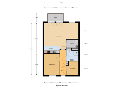 Indeling appartement gelegen op de 1e etage: