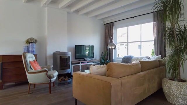 De ruime woon-/eetkamer is voorzien van een allesbrander en dubbele openslaande tuindeuren. Grote raampartijen aan de voor-, zij- en achterzijde zorgen voor een optimale lichtinval. De living is stijlvol afgewerkt met onder andere een balkenplafond, glad stucwerk, designradiatoren en op maat gemaakte RVS gordijnroedes.